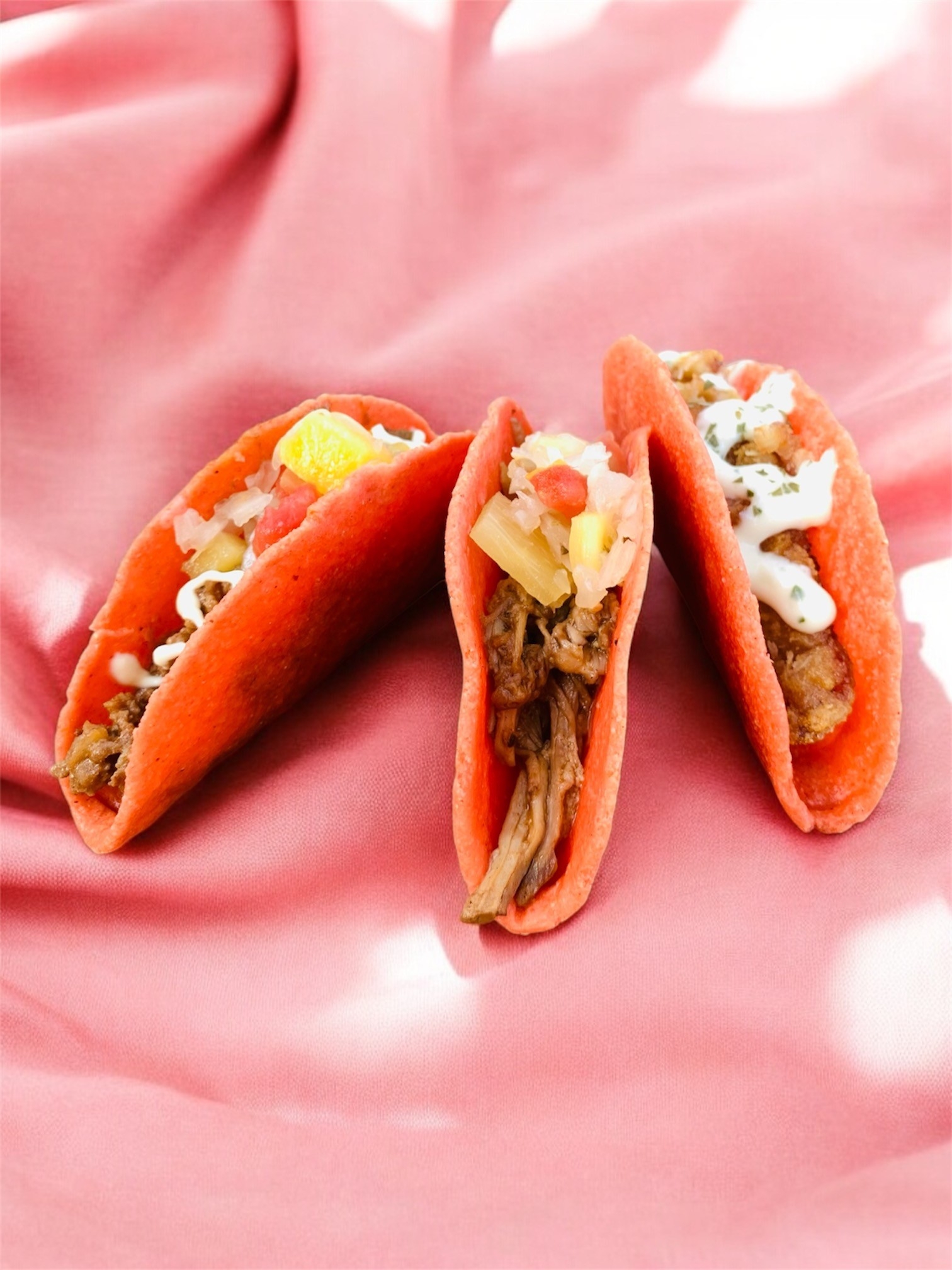 ⟡ 來自恆春滿州 @ waverolltaco #捲浪餅 為粉紅聖誕特製Q版粉色塔可餅,一份三入,一次滿足老饕們的三種願望! 有夾著肥瘦黃金比例的 #美墨醬燒牛,小火炒香墨西哥辣椒及台式辛香料,香辣帶勁,口齒留香! 還有 #慢烤手撕豬,獨家美式調料精心醃漬,小火慢烤出爐,鹹香多汁! 搭配 #炸魷魚塔塔 香脆Q彈魷魚圈搭配獨家特調酸酸甜甜塔塔醬,老少咸宜、一口入魂!